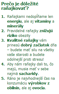 Raňajky sú najdôležitejšie jedlo dňa, preto je veľmi dôležité, aby boli súčasťou aj vášho začiatku dňa. A možno to znie paradoxne, ale nikdy sa vám nepodari schudnúť toľko koľko chcete pokiaľ nebudete pravidelne raňajkovať. Mali by ste si na ne vyhradiť aspom 15 minút. Dodávajú telu tekutiny a potrebné živiny,ktoré vaše telo nedostalo počas spánku.Dokázalo sa, že kto sa ráno dobre naraňajkuje je počas dňa pokojnejší a vie sa lepšie sústrediť na prácu, ktorú má urobiť.